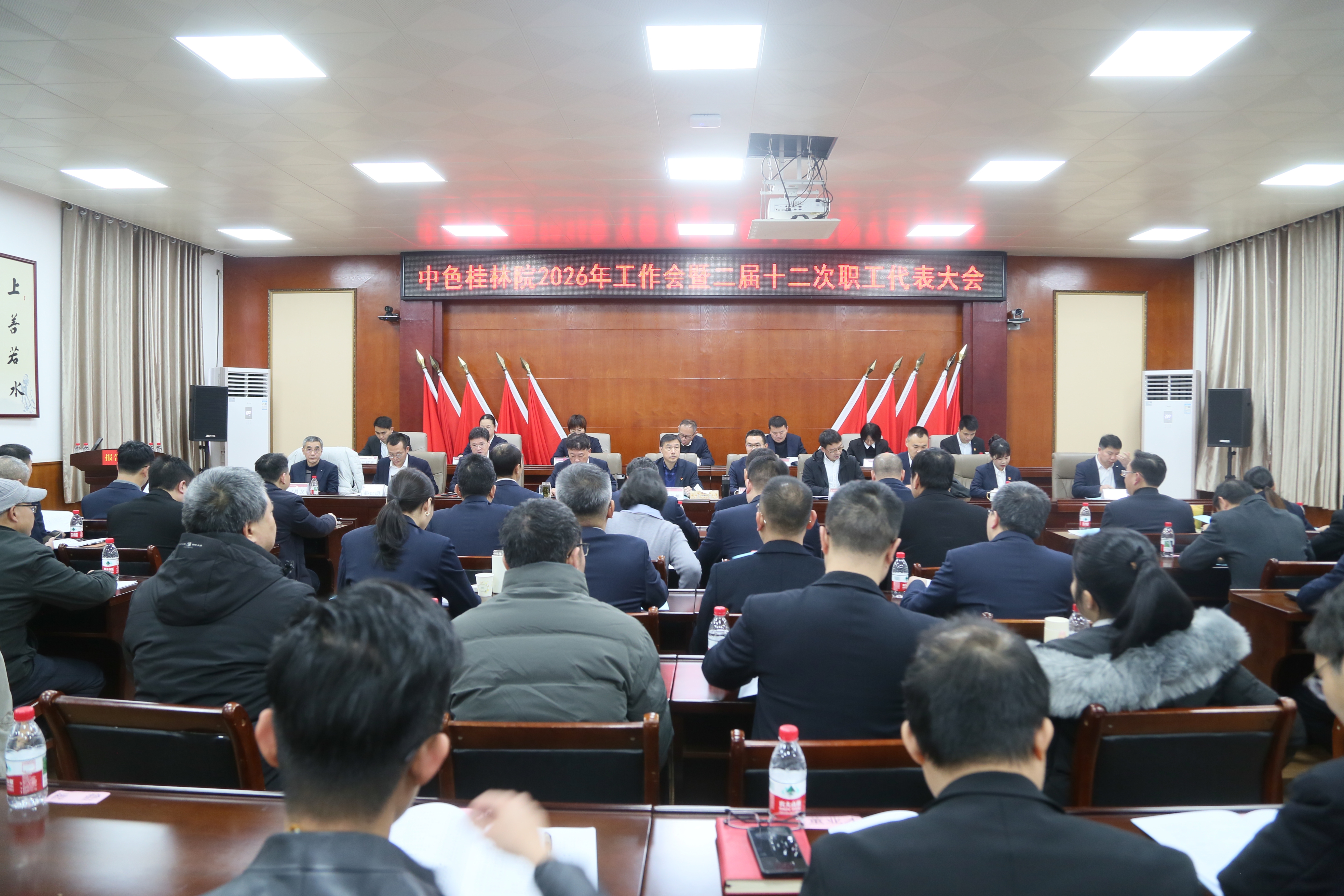 胡朋作了题为《创新赋能打造新质生产力 找矿突破助推高质量发展 奋力谱写桂林院“十五五”开局新篇章》的工作报告。报告全面总结了2025年工作成绩:一是强化经营管控,经济运行稳中向好;二是狠抓专项行动,努力当好“两个主力军”排头兵;三是布局战新未来产业,科技创新引领赋能;四是收官“科改示范”行动,深化改革取得实效;五是深化依法治企,筑牢合规风控防线;六是强化党建引领,以风清气正政治生态凝聚奋斗合力。报告对2026年主要工作进行了部署:一是高站位推进巡视整改,着力提升经营管理水平;二是扎实推进增储上产,矿权经营实现突破;三是有序推进产业提升,新材料板块扩能提质;四是一体推进科技人才建设,有效提升创新引领力;五是统筹发展与安全环保,全力防范经营风险;六是切实加强党的建设,以高质量党建引领高质量发展。